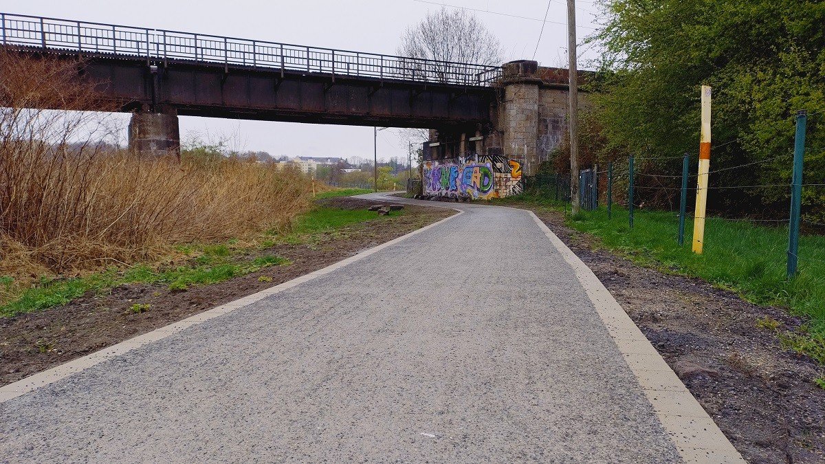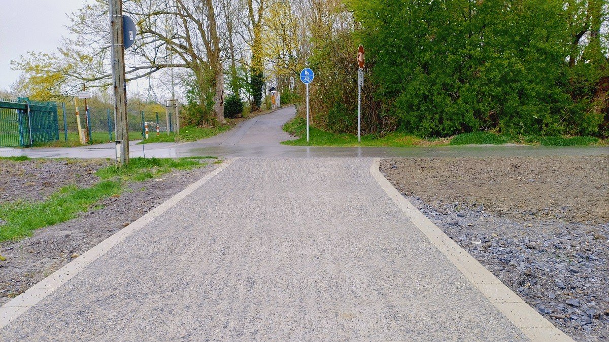 De firma Schemel & Co. Asphalt- und Straßenbau GmbH uit Essen heeft in de winter van 2026 het halfverharde fietspad tussen de Kurt-Schumacher-Brücke en de bushalte Langenberger Str./Drehscheibe volledig vernieuwd.