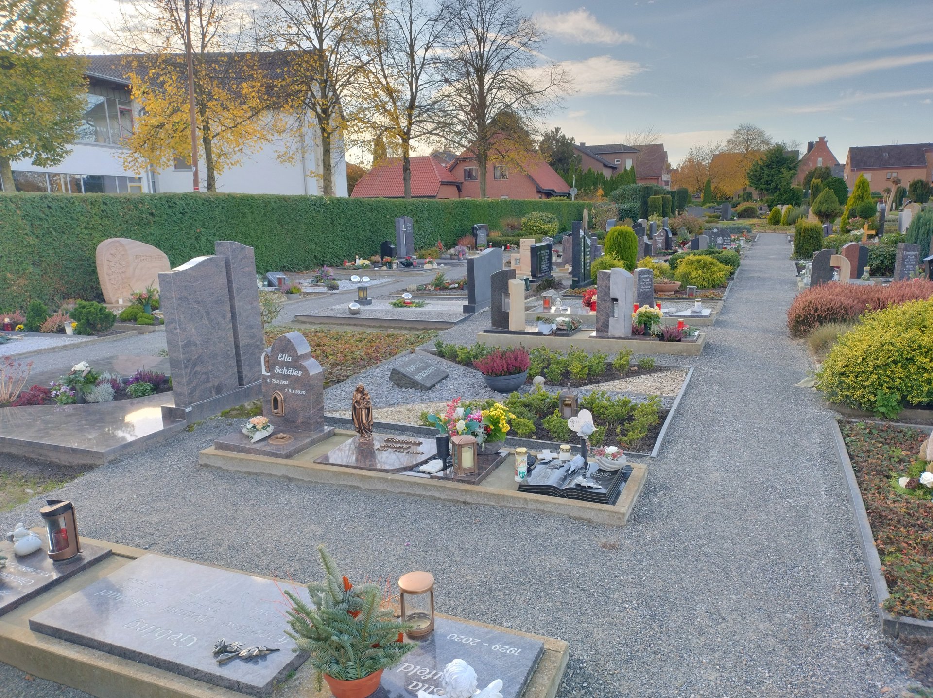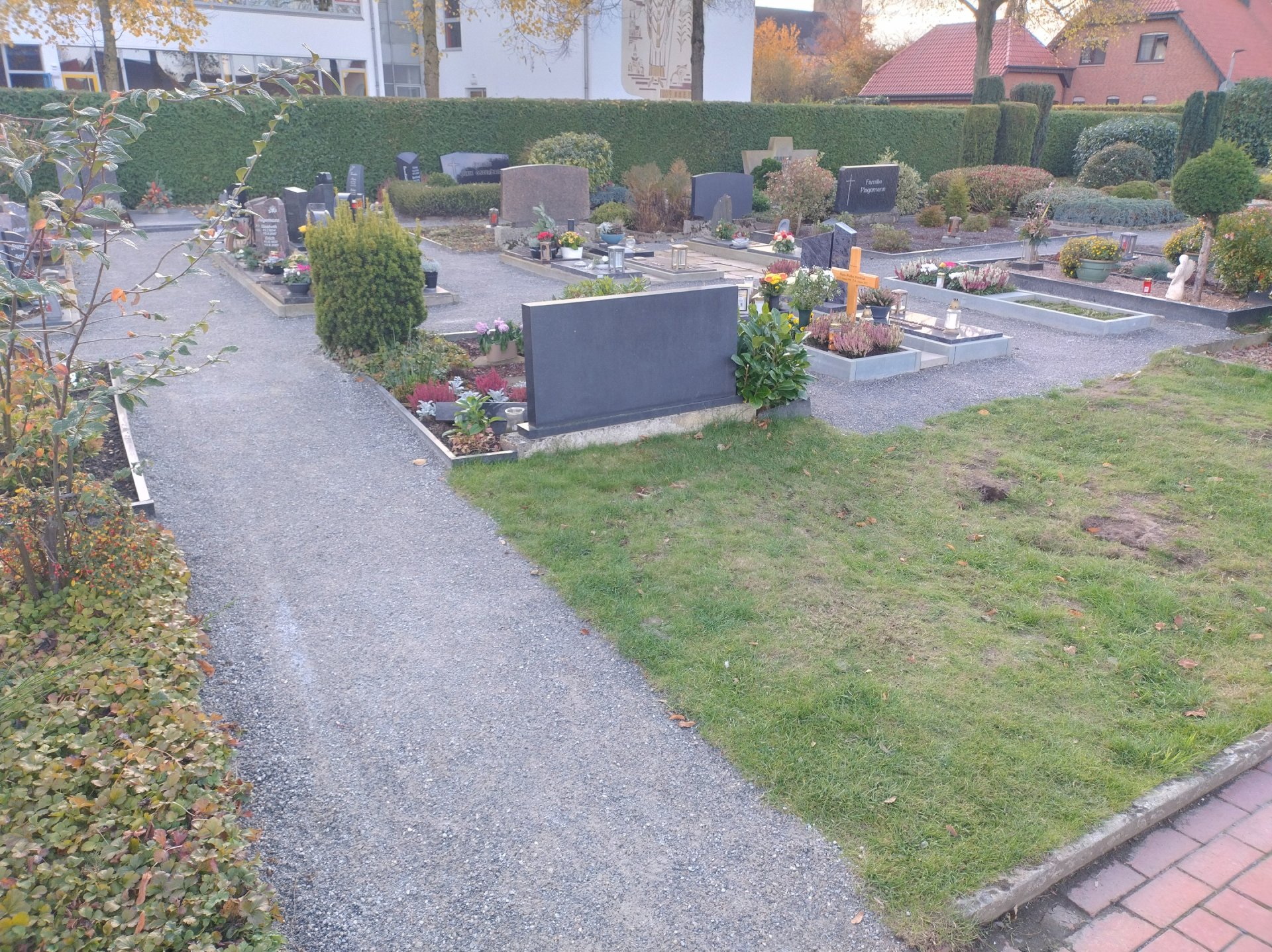 De begraafplaatsaanlegger van het bedrijf Seveneick heeft in september in de zuidoostelijke hoek van de begraafplaats in Hörstel de zones tussen de graven verhard met Koers DurEko-mix. Het resultaat oogt zeer charmant. De grijze kleur van de toplaag sluit mooi aan bij de randafwerkingen van de paden en de graven. De kleuren van de bloemenarrangementen, kaarsen en andere decoraties die bezoekers uit liefde voor hun overleden dierbaren hebben meegebracht, trekken de aandacht en geven het geheel een warme, emotionele sfeer.