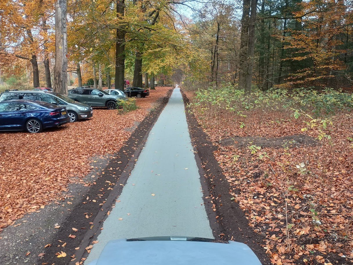 Voor de aanleg van de fietspaden is bewust gekozen voor DurEko-mix, een waterdoorlatende halfverharding die uitstekend past binnen een kwetsbare en ecologisch waardevolle omgeving. Het materiaal biedt een hoge mate van stabiliteit en comfort voor fietsers, terwijl het tegelijkertijd een natuurlijk ogend oppervlak heeft dat harmonieus opgaat in het landschap van de Veluwe.