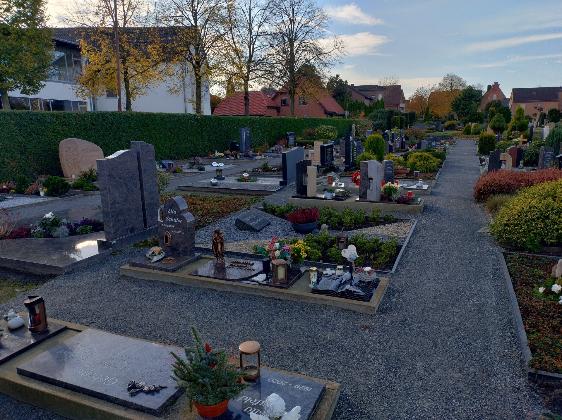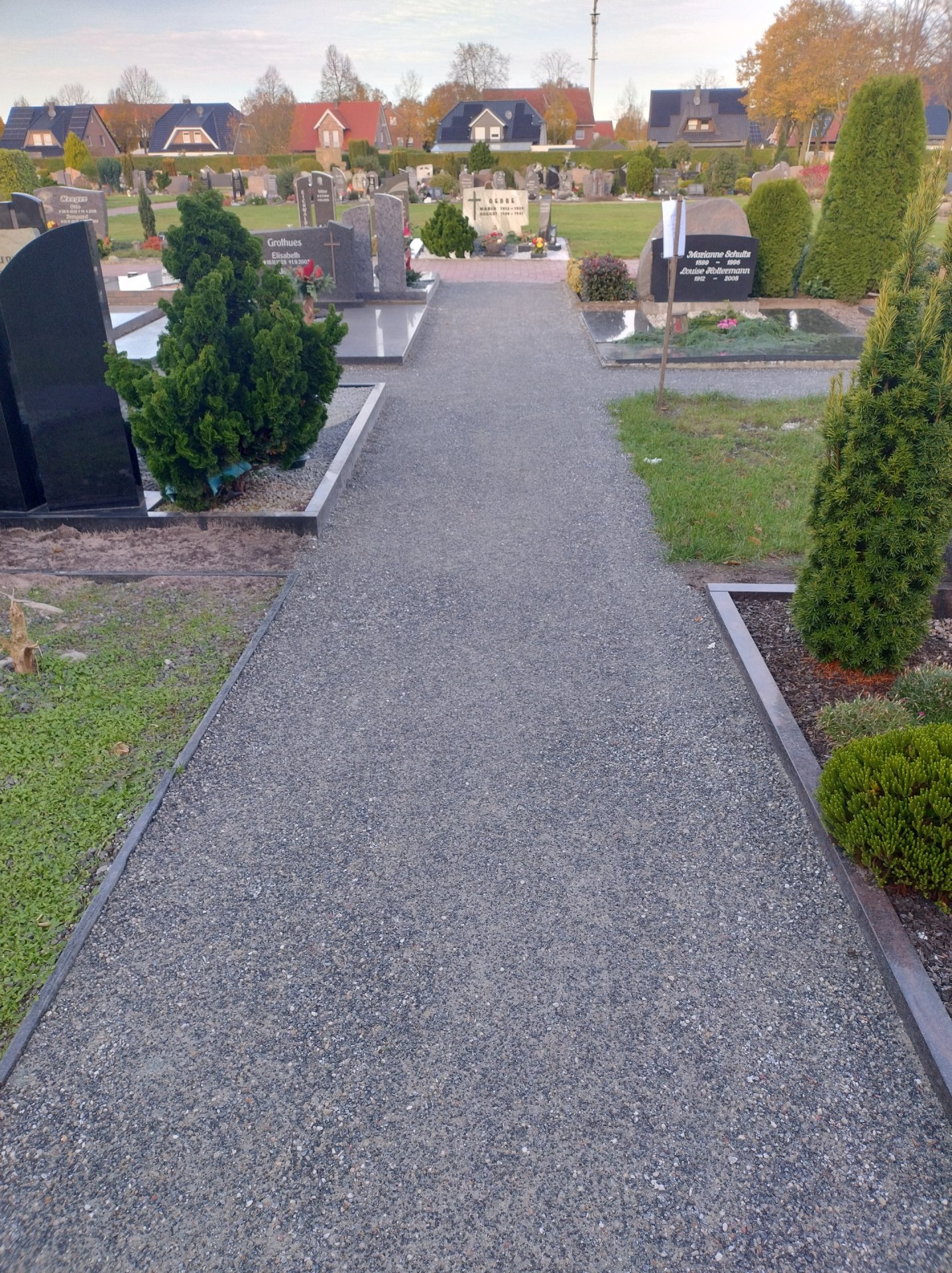 Die Friedhofsgärtnerei der Firma Seveneick hat im September in der südöstlichen Ecke vom Friedhof in Hörstel mit Koers DurEko-mix die Flächen zwischen den Gräber gepflastert. Das Ergebniss sieht sehr charmant aus. Das graue der Deckschicht ist ein Match zu den Randeinfassungen der Wege und der Gräber. Die Farben der Blumenarrangements, Kerzen und anderer Dekorationen, die Besucher aus Liebe zu ihren verstorbenen Angehörigen mitgebracht haben, sind ein Blickfang und verleihen dem Ganzen eine warme, emotionale Atmosphäre.