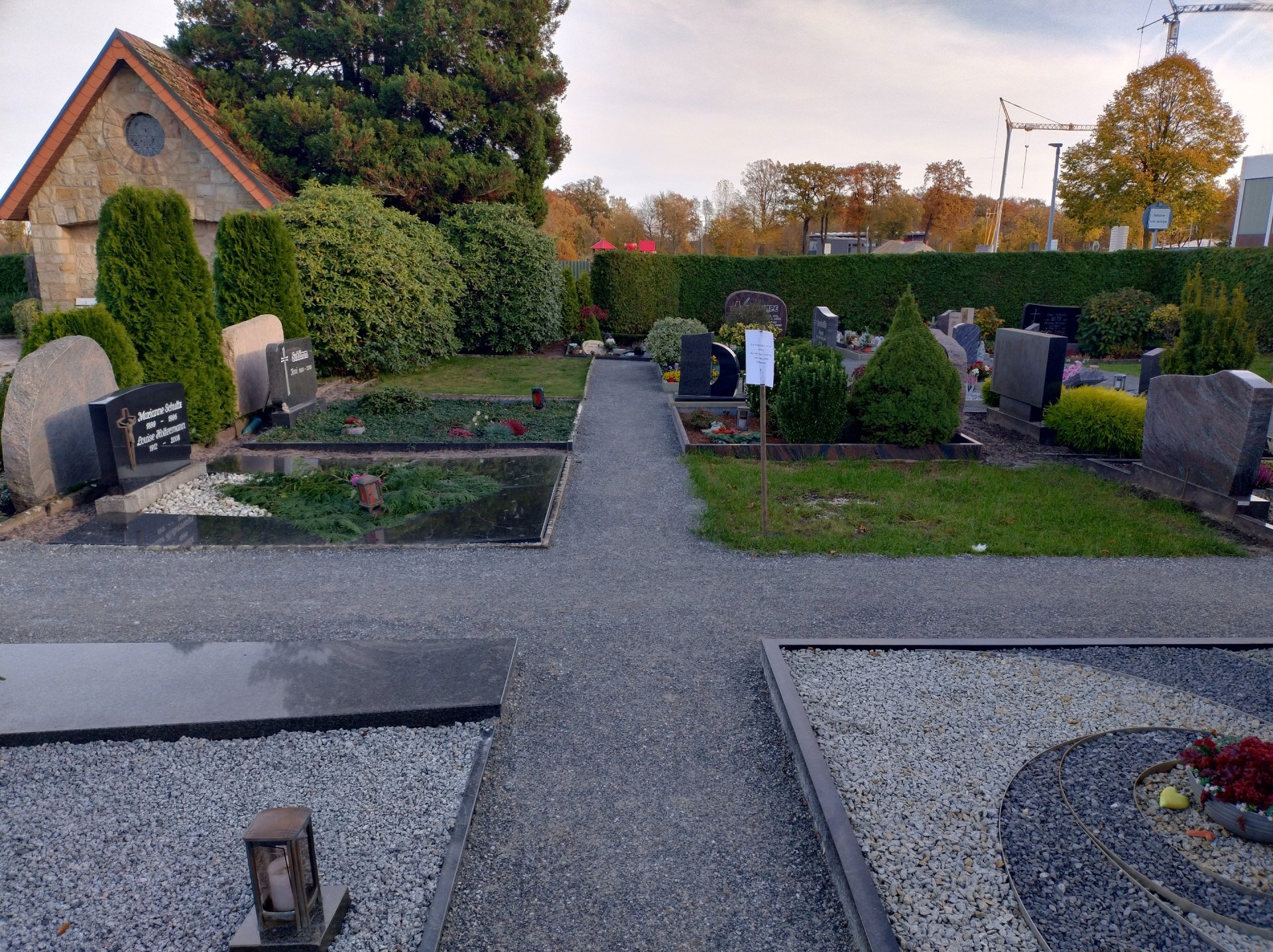 Es war bestimmt nicht einfach, um die teilweise sehr schmalen Flächen mit DurEko-mix zu verdichten. Obwol es nur um ca. 100 m2 handelt, hat diese Arbeit viel Zeit in Anspruch genommen. Die Friedhofsgärtnerei hat zur sicherheit Schilder aufgestellt, um die Besucher darauf aufmercksam zu machen dass man den Weg nicht Harken darf. Wenn die DurEko-mix Deckschicht einmal abgebunden ist, haben sich die Körner Festgesetzt und darf die Decke nicht aufgemacht werden.