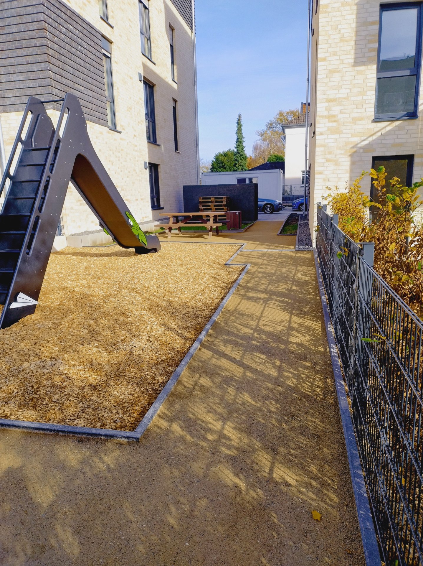 À l’automne 2025, l’entreprise Galabau Rainer Eschbach de Much a appliqué des couches de surface en Koers KoMex Jaune sur plusieurs petites aires de jeux et allées piétonnes dans le nouveau quartier résidentiel de la Uferstraße à Leichlingen. Le quartier comprend 69 nouveaux appartements en copropriété répartis sur cinq bâtiments, à seulement quelques centaines de mètres de la Wupper et du centre-ville.